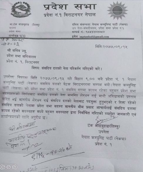 मुख्यमन्त्री राईविरुद्ध अविश्वासको प्रस्ताव दर्ता गरेको प्रचण्ड–माधव समूहले भीम आचार्यलाई मुख्यमन्त्रीमा प्रस्ताव गरेको थियो । आज बसेको बहुमत सांसदको बैठकले राईलाई हटाएर आचार्यलाई दलको नेता चयन गरेको छ । प्रदेश १ मा नेकपाका ६७ सांसद छन् । उनीहरुमध्ये ३७ जनाले राईविरुद्ध अविश्वासको प्रस्तावमा हस्ताक्षर गरेका थिए । नेकपा संसदीय दलको नेता परिवर्तन गर्न यसअघि प्रदेशसभाका ३६ सदस्यले उपेनता टंक आङ्बुहाङलाई पत्र बुझाएका थिए । पत्र प्राप्त भएपछि आङ्बुहाङले पुस १९ गते संसदीय दलको बैठक बोलाउनुभएकोमा मुख्यमन्त्री राईले अविश्वास प्रस्ताव पेश गर्नेलाई स्पष्टिकरण सोधेपछि आज बिहान नै आकस्मिक रुपमा संसदीय दलको बैठक बोलाईएको थियो । बहुमत सदस्यको अविश्वास प्रस्ताव आएपछि दलको नेताको हैसियतमा कुनै पनि काम नगर्न सुचित गरेको भएपनि मुख्यमन्त्रीले स्पष्टिकरण सोध्ने र सांसदलाई धम्क्याउने काम गरेकाले आकस्मिक बैठक बोलाएको नेता आङ्बुहाङले जानकारी दिनुभयो । आज बिहान ९ बजे बसेको बैठकले राईलाई पदमुक्त गरेर आचार्यलाई दलको नेतामा चयन गरेको उहाँको भनाइ छ । दलका उपनेता टंक आङ्बुहाङले प्रदेश–१ प्रदेशसभा सचिवालयमा पुगेर दलको नेताबाट वर्तमान मुख्यमन्त्री तथा आफ्नो दलका नेता राईलाई बहुमत सांसदहरुले निष्कासन गरेको पत्र दर्ता गराउनुभएको सभामुख प्रदिपकुमार भण्डारीले जानकारी दिनुभयो । प्रदेशसभामा नेकपाको दलको नेता परिवर्तन भएको जानकारी पत्र दर्ता भएको उहाँको भनाइ छ । यसैबीच प्रदेश १ का नेकपाका १५ जना सांसदलाई नेकपाका संसदीय दलका नेता शेरधन राईले ३ महिनाका लागि निलम्बन गर्नुभएको छ। निलम्वन हुनेहरु दाहाल नेपाल समूहका सांसद हुन । यसअघि मुख्यमन्त्री शेरधन राईविरुद्ध अविश्वासको प्रस्ताव ल्याएका दाहाल नेपाल समूहका ३७ जना सांसद मध्ये