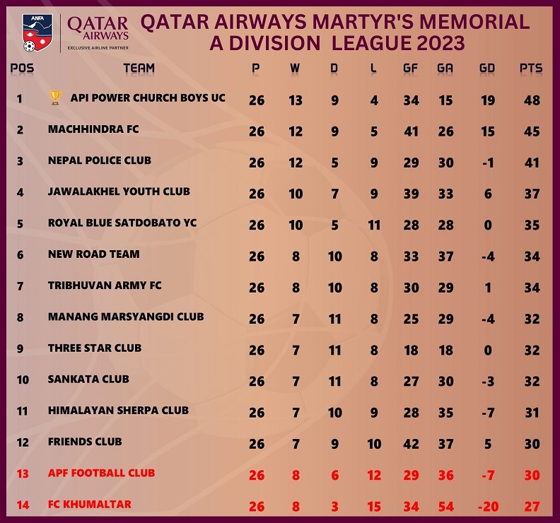 यस जितसँगै थ्री स्टार रेलिगेसनबाट जोगिएको छ । थ्री स्टारले २६ खेलमा ३२ अंक जोड्दै नवौं स्थानमा उक्लिएको छ । थ्री स्टारको जितले विभागीय टोली एपीएफ क्लव भने रेलिगेसनमा परेको छ । २०६२ सालबाट ‘ए’ लिग खेलिरहेको एपीएफ पहिलो पटक ‘बी’ डिभिजन लिगमा घटुवा भएको हो । उता जावलाखेलले भने हारबाट सिजनको अन्त्य गरेको छ । जावलाखेलले २६ खेलमा ३७ अंक जोड्यो । जावलाखेले चौथो स्थानमा रहँदै सिजनको अन्त्य गरेको छ । लिग अन्तर्गत शनिवार नै दशरथ रंगशालामा भएको खेलमा मच्छिन्द्रले एक गोलको अग्रता उल्टाएर मनाङलाई ३–१ गोल अन्तरले पराजित ग¥यो । मच्छिन्द्रको जितमा आफिज ओलावाले दुई र विमल घर्ती मगरले एक एक गोल गरे । मनाङका विजय श्रेष्ठले १६ औं मिनेट शुरुवाती अग्रता निकालेका थिए । खेलको ८० औं मिनेटमा ओलावालेले गोल गर्दै मच्छिन्द्रलाई १–१ गोलको बराबरीमा ल्याउँदा ८६ औं मिनेटमा विमलले गोल गर्दै मच्छिन्द्रको अग्रता उल्टाएका थिए । त्यसपछि खेलको इन्जुरी समयमा ओलावालेले व्यक्तिगत दोस्रो गोल गर्दै मच्छिन्द्रलाई ३–१ को जित दिलाए । यस जितसँगै लिगको उपविजेता मच्छिन्द्रले सिजनको सुखद् अन्त्य गरेको छ । मच्छिन्द्रले २६ खेलमा ४५ अंक जोड्यो । मनाङले भने हारबाट