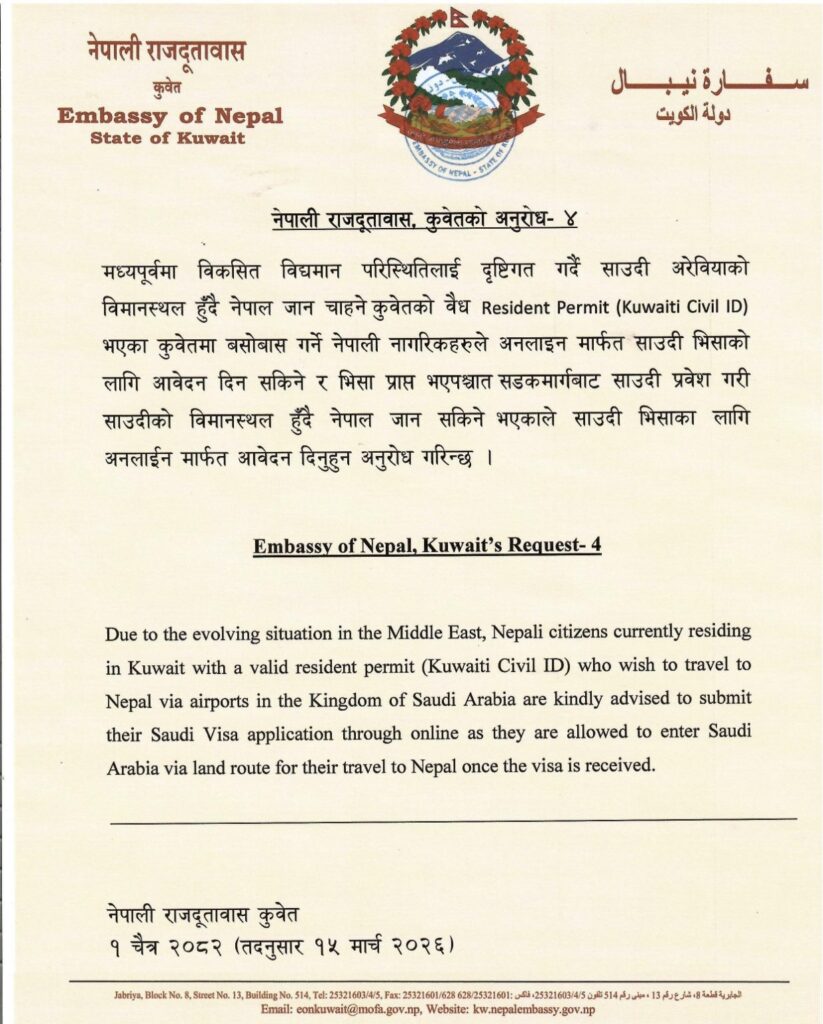 काठमाडौँ, चैत १ – कुवेतमा वैध रेसिडेन्ट पर्मिट (कुवेती सिभिल आईडी) भएका नेपालीहरूले साउदी अरब हुँदै नेपाल फर्किन पाउने भएका छन्।
